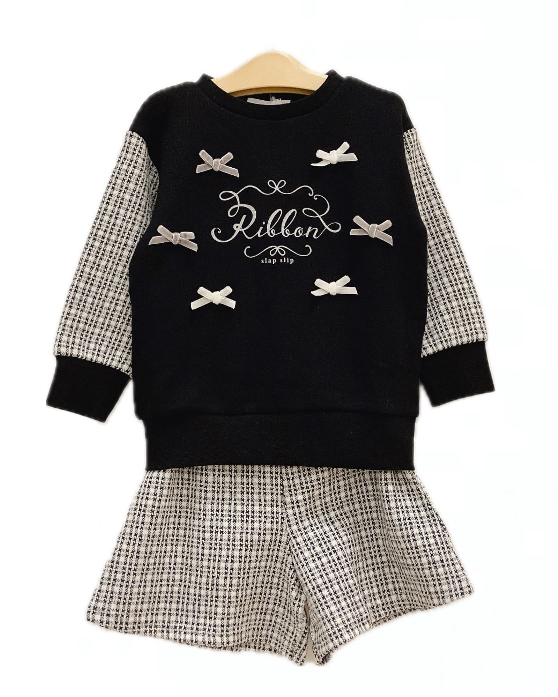 SLAP SLIP きらめくグリッタープリントトレーナー+ケーブル編みチェックショートパンツ2点セット ブラック BeBe