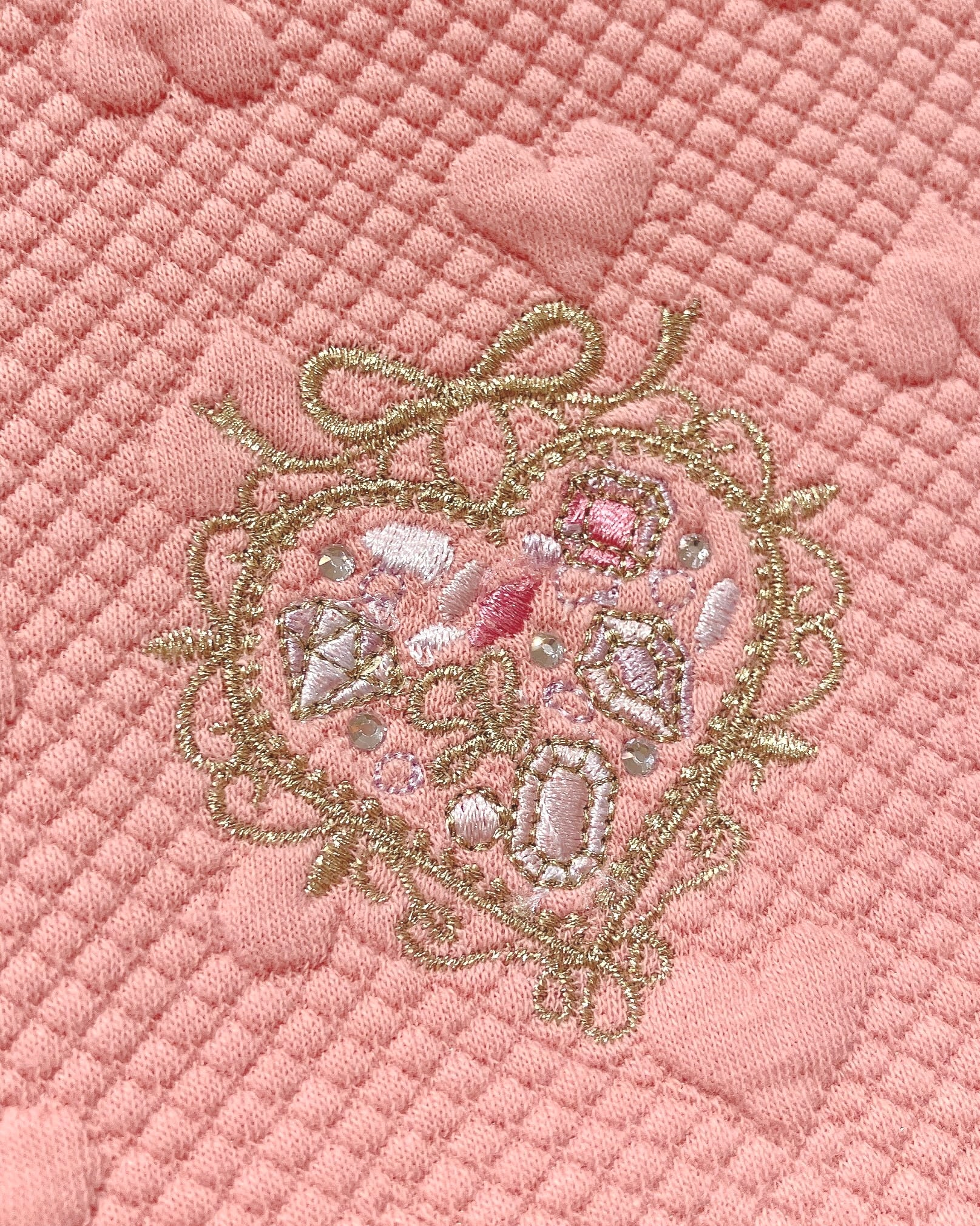 フロントにはラメ糸の刺しゅうとラインストーンで描かれたハートのレリーフがきらり.⁺