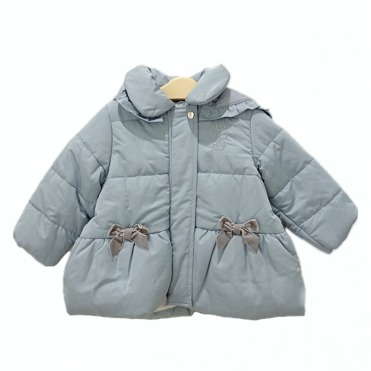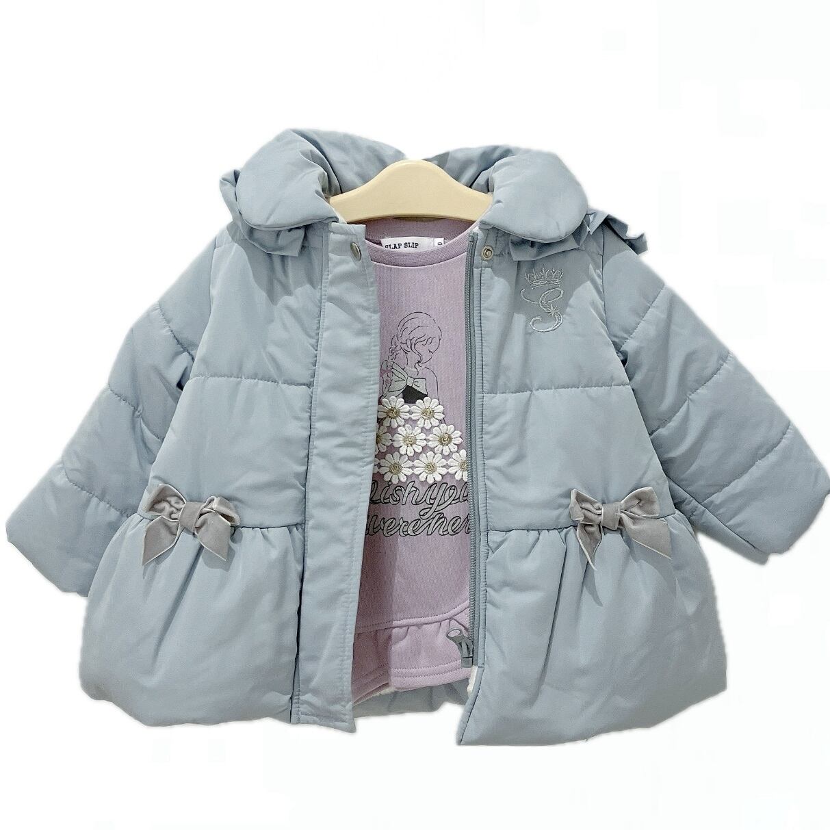 裾に向かって広がるAラインのデザインやフードの縁や切り替え部分にほどこした2段のフリルがガーリーなアイテム、後ろ姿も可愛いにこだわった1着に仕上げました。