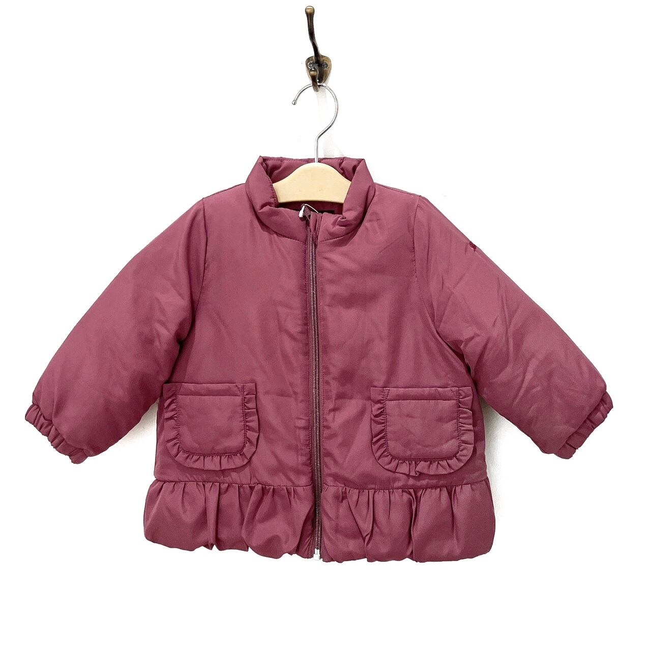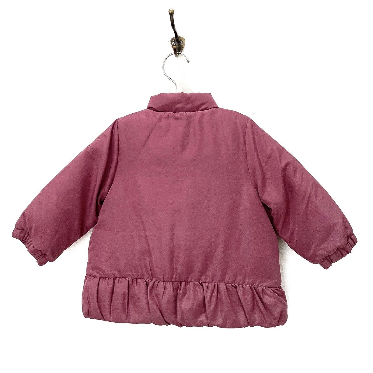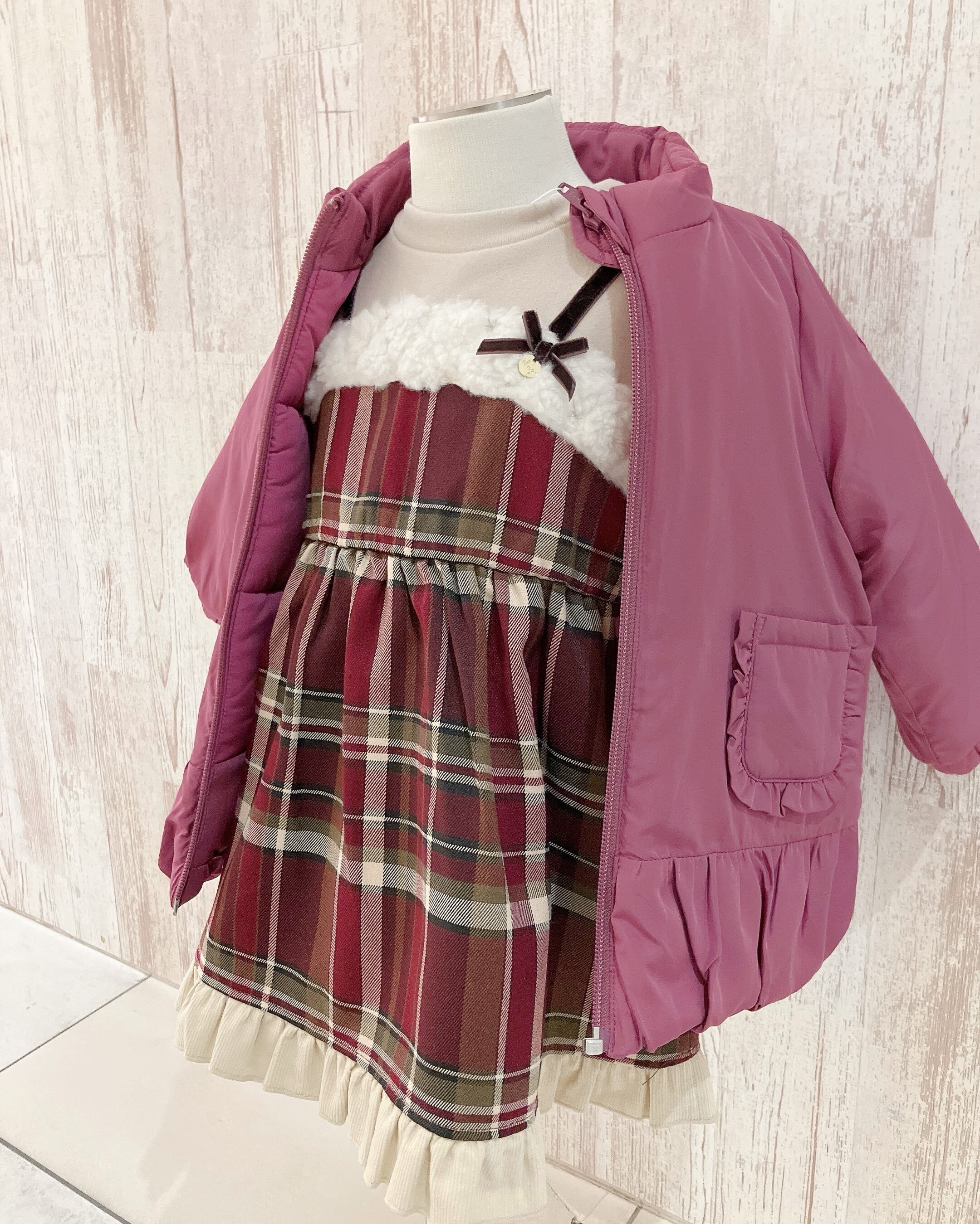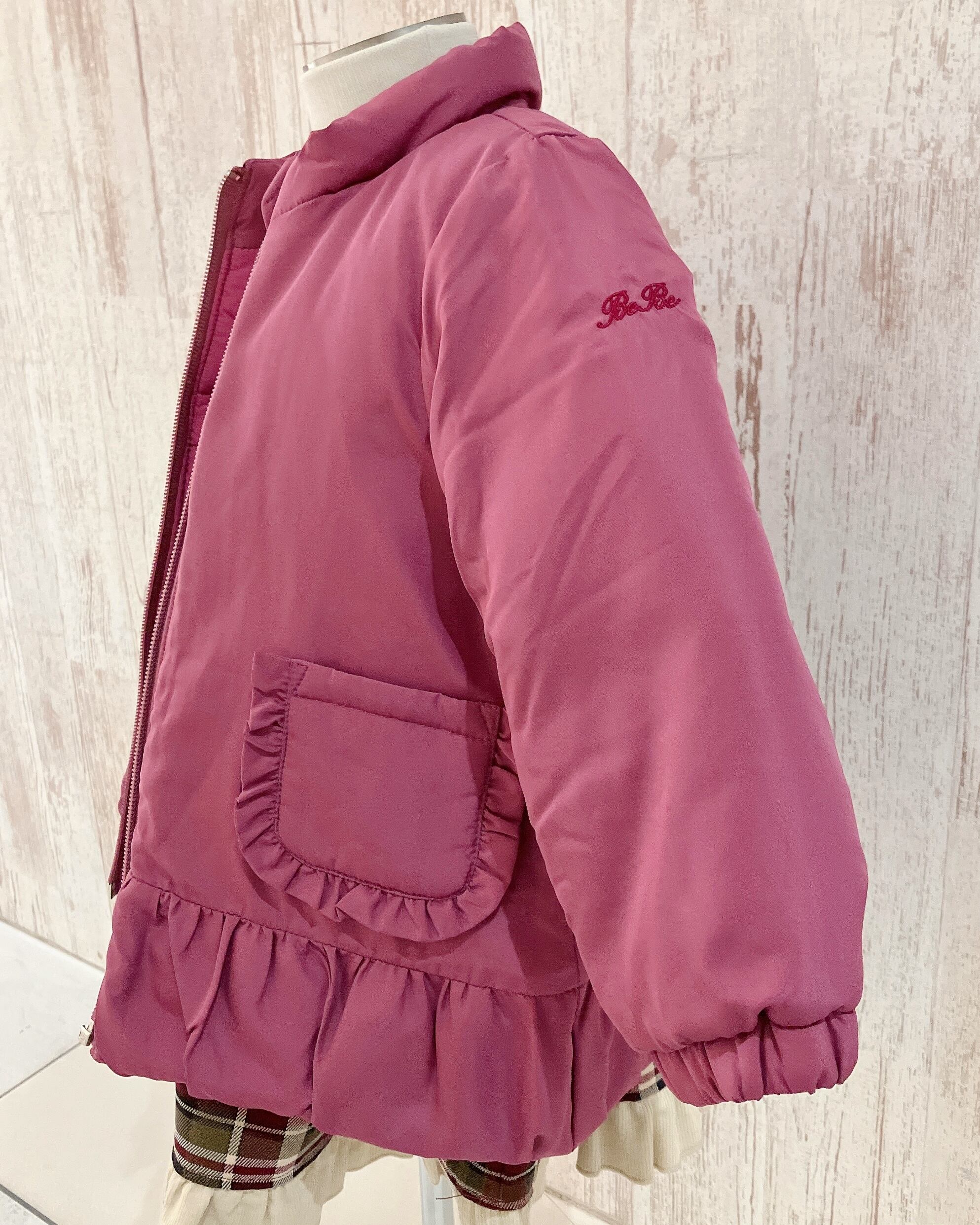 裾のギャザー切り替えとフリルポケットが女の子らしい中綿コート。